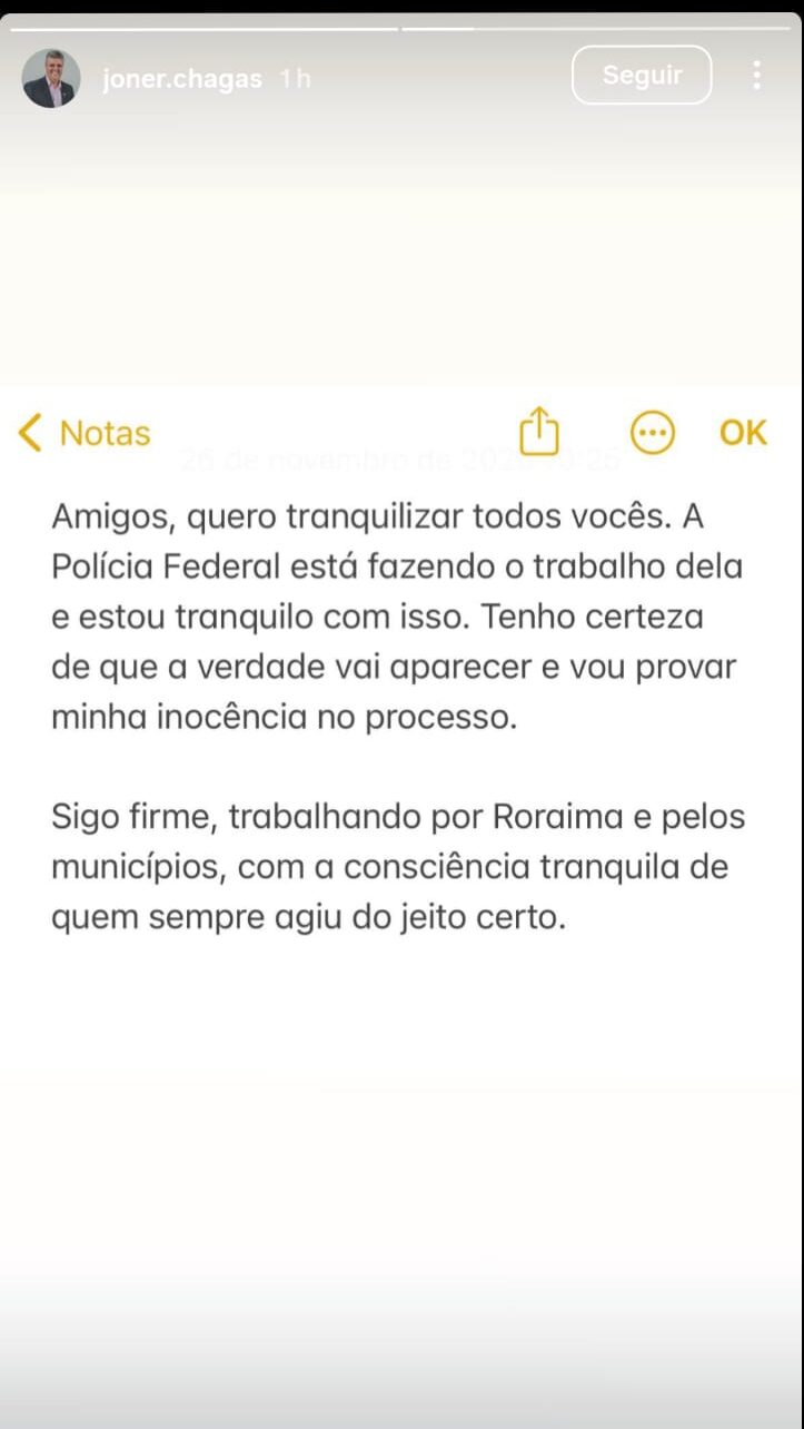 Ele também declarou seguir trabalhando normalmente. “Sigo firme, trabalhando por Roraima e pelos municípios, com a consciência tranquila de quem sempre agiu do jeito certo”, declarou.