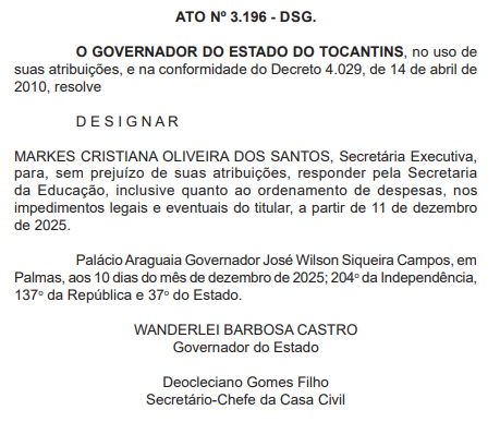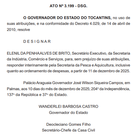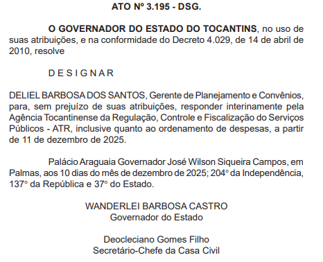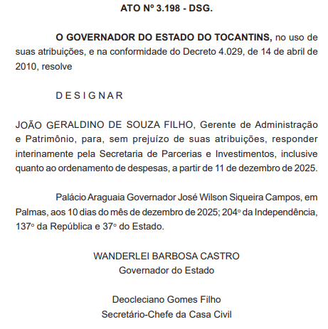 Segundo os atos publicados, Deliel Barbosa dos Santos, Gerente de Planejamento e Convênios, foi designado para responder pela Agência Tocantinense da Regulação, Controle e Fiscalização dos Serviços Públicos (ATR). Na Secretaria de Parcerias e Investimentos, foi designado João Geraldino de Souza Filho, Gerente de Administração e Patrimônio.