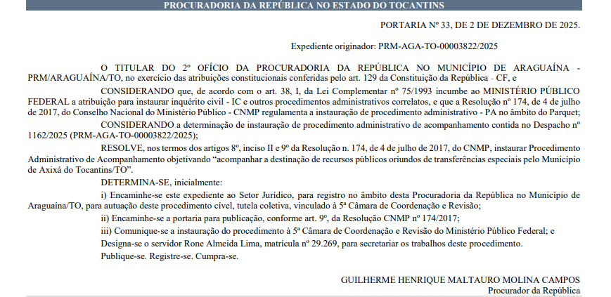 O Ministério Público Federal (MPF) divulgou, em Diário Oficial desta quinta-feira (11), a instauração de um Procedimento Administrativo para monitorar a destinação de recursos ao município de Axixá do Tocantins. A medida foi formalizada pela Portaria nº 33, assinada pelo procurador da República Guilherme Henrique Maltauro Molina Campos.
