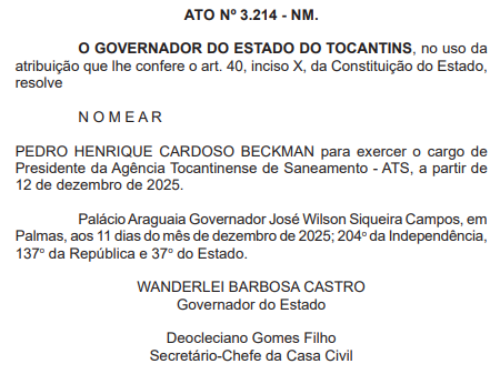 Pedro Henrique Cardoso Beckman foi nomeado presidente da Agência Tocantinense de Saneamento (ATS). Ele é ex-vereador de Palmas, filho do deputado estadual Cleiton Cardoso (Republicanos) e foi candidato a vice-prefeito na chapa de Janad Valcari (PL) nas eleições municipais de 2024.