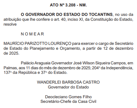 O governador do Tocantins, Wanderlei Barbosa (Republicanos), fez duas nomeações, no Diário Oficial do Estado (DOE), para cargos da administração estadual, com efeitos a partir desta sexta-feira (12).
