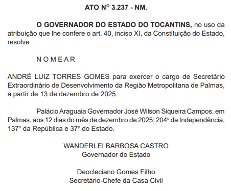• Andrê Luiz Torres Gomes – Secretário Extraordinário de Desenvolvimento da Região Metropolitana de Palmas.