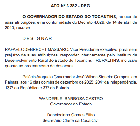 • Rafael Odebrecht Massaro – Presidente interino do Instituto de Desenvolvimento Rural do Estado do Tocantins (Ruraltins), mantendo o cargo de Vice-Presidente Executivo.