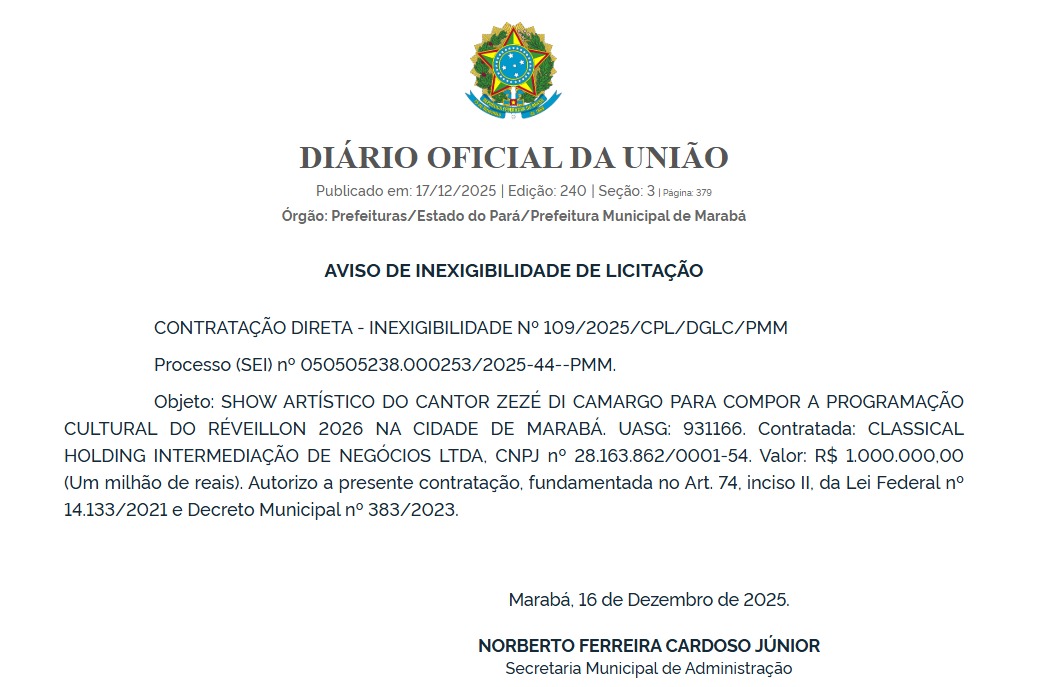 A Prefeitura de Marabá, no sudeste do Pará, contratou o cantor sertanejo Zezé Di Camargo por R$ 1 milhão para se apresentar no Réveillon 2026 da cidade. O contrato foi firmado nesta terça-feira, 16, sem licitação.