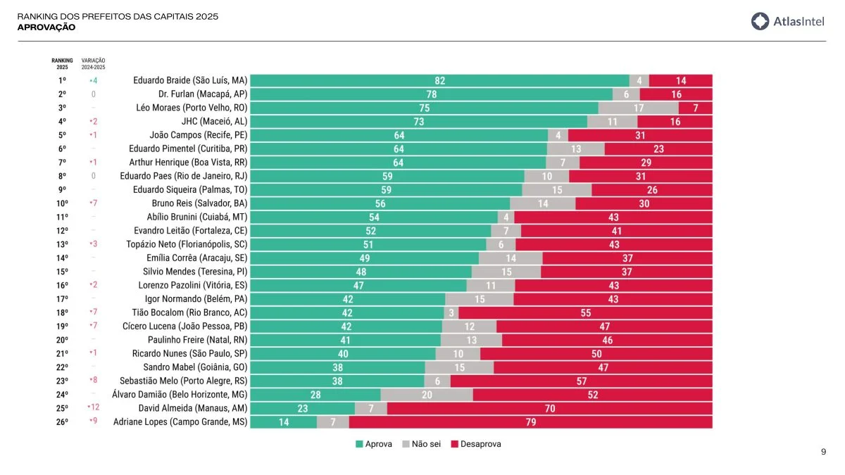 A pesquisa nacional do instituto AtlasIntel posicionou o prefeito de Belém, Igor Normando (MDB), na 17ª colocação no ranking geral de aprovação entre os prefeitos das capitais brasileiras. O estudo avaliou 26 gestores municipais.