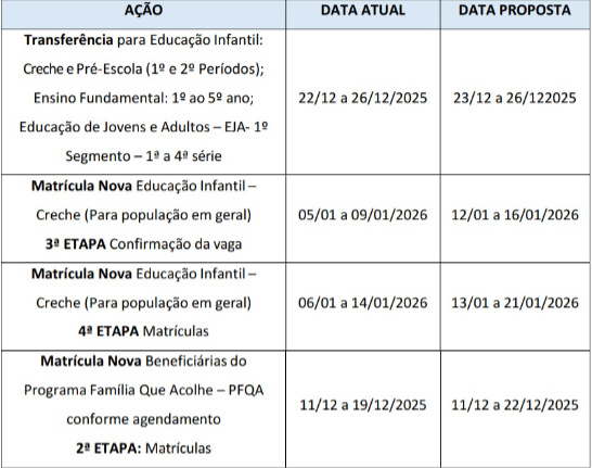 Também foram alteradas as datas da Matrícula Nova da Educação Infantil – Creche (população em geral). A 3ª etapa, referente à confirmação da vaga, foi remanejada de 5 a 9 de janeiro de 2026 para o período de 12 a 16 de janeiro de 2026. Já a 4ª etapa, destinada à efetivação das matrículas, passa de 6 a 14 de janeiro de 2026 para 13 a 21 de janeiro de 2026.