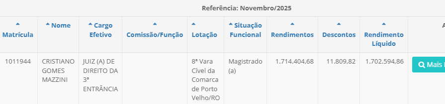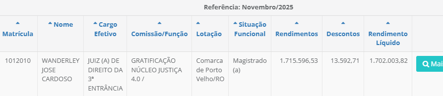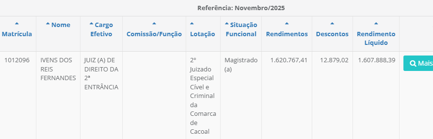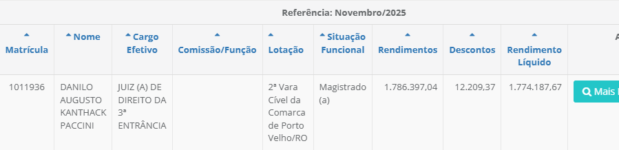 Conforme os registros, os magistrados e os respectivos rendimentos em novembro são: