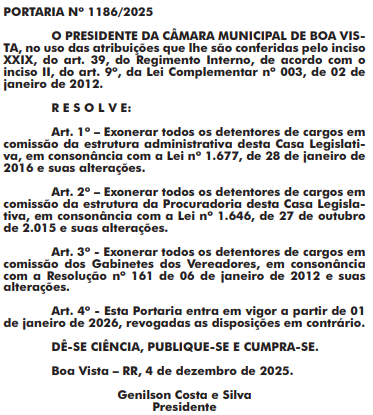 A Câmara Municipal de Boa Vista publicou no Diário Oficial uma portaria que determina a exoneração de todos funcionários comissionados do parlamento municipal, a partir do dia 1º de janeiro de 2026.