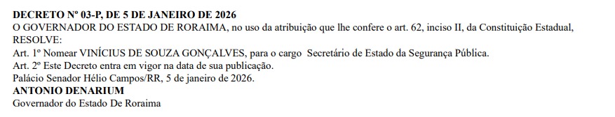 O delegado Vinícius de Souza Gonçalves foi nomeado para o cargo de secretário de Estado da Segurança Pública de Roraima. A nomeação foi formalizada por meio do Decreto nº 03-P, de 5 de janeiro, assinado pelo governador Antonio Denarium (PP).