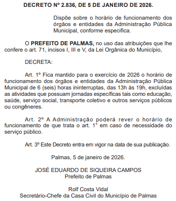 A Prefeitura de Palmas publicou, no Diário Oficial do Município (DOM), desta segunda-feira (5) um decreto que trata do horário de funcionamento dos órgãos e entidades da Administração Pública.