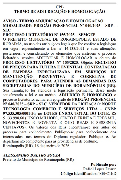 A manutenção preventiva e corretiva de computadores vai custar R$ 5.133.998,60 aos cofres da Prefeitura de Rorainópolis. O prefeito Alessandro Dautro, conhecido como Pinto do Equador (Republicanos), assinou a homologação da contratação que foi publicada no Diário Oficial dos Municípios de Roraima (DOM-RR) desta segunda-feira, 19.