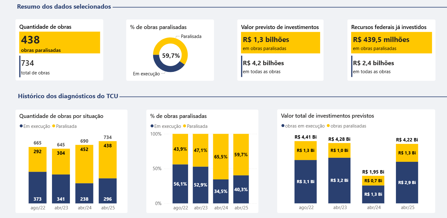 No cenário nacional, o problema se repete em larga escala. O Tribunal de Contas da União aponta que 50,7% das obras federais em todo o país estão paralisadas. Ao todo, são 11.469 empreendimentos interrompidos entre 22.607 monitorados.