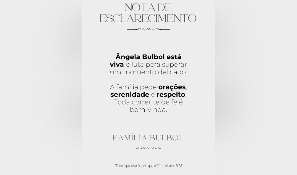 A família da ex-gestora pública Ângela Neves Bulbol de Lima divulgou nota na noite de sexta-feira (20), por volta das 22h30, informando que ela está viva e segue sob cuidados médicos, após a circulação de informações sobre suposta morte encefálica. No comunicado, os familiares afirmaram que Ângela enfrenta um quadro delicado, mas continua em tratamento.